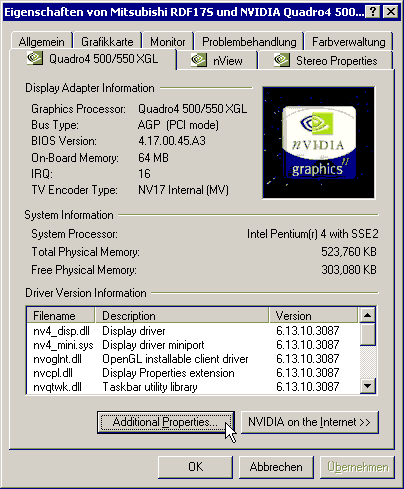 Viele NVidia Grafikkarten lassen sich jedoch softwaremäßig in eine "Quadro Serie" umpatchen, so daß dann nicht nur die professionellen Funktionen unter OpenGL zur Verfügung stehen, sondern zusätzlich noch deutlich beschleunigt werden. Diese kann mit Hilfe von RivaTuner unter Win200/XP (funktioniert NICHT unter Win9.x) durchgeführt werden. Das Patchen selber sollte bitte NUR VON ERFAHENEN SPEZIALISTEN durchgeführt werden und genau nach Anleitung erfolgen. Vor Durchführen dieses Patches wird eine Komplettsicherung des Systems angeraten!