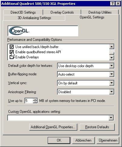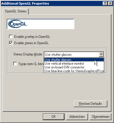 Um quad-buffer stereo OpenGL Funktionen nutzen zu können wird ein professionelle Grafikkarte benötigt die diese Funktionen implementiert haben. Hierzu gehören z.B. NVidia Quadro Serie, Oxygen's, Wildcats