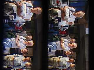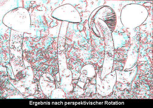 Durch perspektivische Rotation um die vertikale Achse können diese Trapezverzerrungen ausgeglichen werden. Betrachtet man das Bild nach dieser Korrektur fällt noch auf, daß Objekte vor dem Stereofenster liegen.