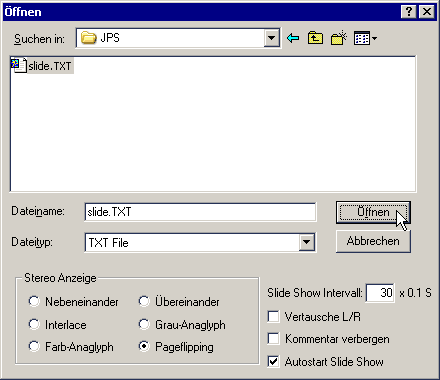 Zur Darstellung können die Bilder entweder einzeln, als Anaglypen oder im Wechsel (Angaben in hundertstel Sekunden) dargestellt werden.