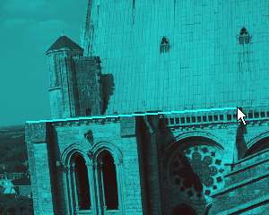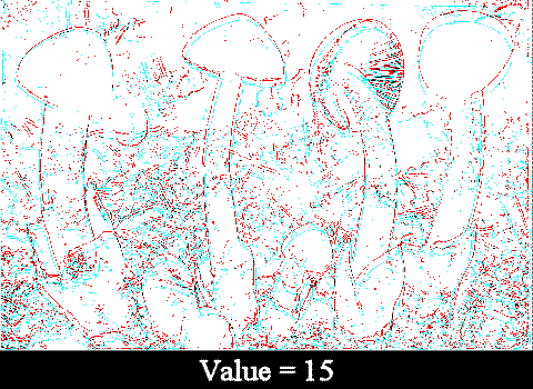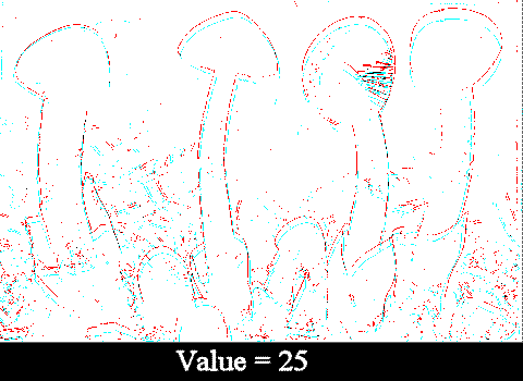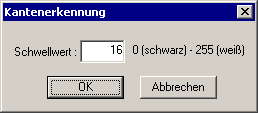 Zur besseren Justage kann zudem die Kantenerkennungsfunktion herangezogen werden. Bei dieser Funktion werden Konturen (Kanten) der beiden Bilder berechnet und dargestellt. dieses erleichtert eine genaue Ausrichtung (manuell oder automatisch). Die Kantenerkennung kann je nach Bildgröße etwas Zeit in Anspruch nehmen. Der Schwellwert der Kantenerkennung ist standardmäßig auf den Wert 16 festgelegt, kann jedoch im Bereich zwischen 0 (schwarz) und 255 (weiß) angepaßt werden. Weitere Informationen hierzu siehe unter: 'Kantenerkennung...' .