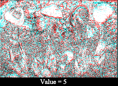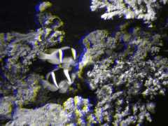 Im Halbton Modus wird die Helligkeit des roten oder gelben Bildteils (links) herabgesetzt um Probleme bei der Betrachtung von Farbanaglyphen zu vermeiden. Als Vergleich sind die oben gezeigten Bilder links als Farb- und rechts als Halbton Anaglyphen dargestellt.