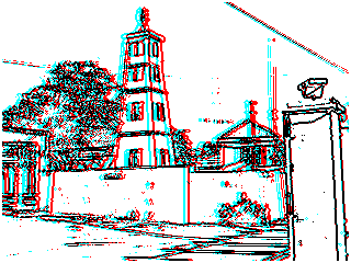 Sofern die beiden Aufnahmen für links/rechts mit zwei Kameras erstellt wurden deren Objektivachsen NICHT parallel angeordnet waren (d.h. eine Konvergenz zueinander aufwiesen - sprich deren Objektivachsen sich schneiden) entstehen zwei Bilder sie zueinander trapezförmige Verzerrungen zeigen. Diese Verzerrungen sind in den Ecken der Bilder im Stereobild erkennbar und wirken je nach verwendeter Konvergenz sehr stöhrend oder führen dazu daß man das Stereobid gar nicht mehr betrachten kann. Das untere Beispiel zeit eine solche Trapezverzerrung eines einzelnen Bildes.