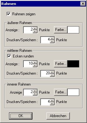 Der mittlere Rahmen kann quadratische oder abgerundete Ecken haben und man kann jede Rahmenbreite getrennt aussuchen für das Bildschirmbild oder gedruckte Bild. Indem man die "zeige Rahmen" Option wählt oder alternativ das Icon