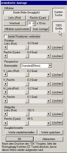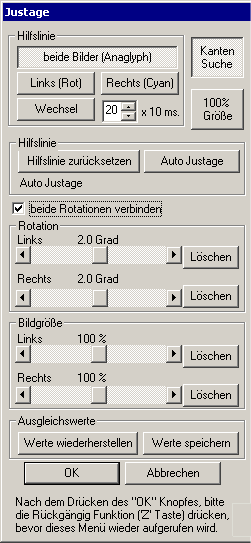 In diesem Dialog wird ein monochromes (Grau-Anaglypen für rot-cyan Brillen) Bild dargestellt. Hier lassen sich mit Hilfe der vertikalen und horizontalen Schiebebalken (bzw. der Schaltknöpfe) die Ausrichtung des linken/rechten Bildes vornehmen. Zudem lassen sich Größe und Rotation unabhängig voneinander (links/rechts) verändern. Die Justagewerte lassen sich wieder zurücksetzen falls die Justage nicht dem gewünschten Ergebnis entspricht.
