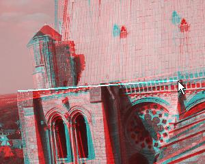Laden Sie das erste Bildpaar und wählen Sie im Menü: Stereo/Grau Anaglyph/rot-cyan. Unabhängig vom späteren Ausgabeformat ist ein Grauanglyphenbild zur Justage sehr gut geeignet, da man hierbei Ausrichtungsfehler sehr leicht erkennen kann.