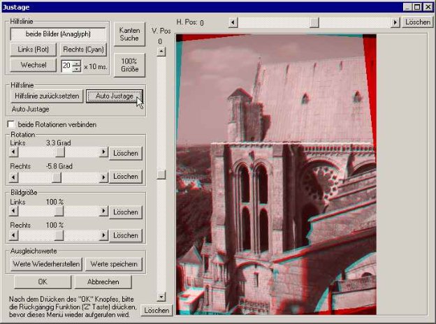 Wählen Sie nun [beide Bilder (Anaglyph)] und drücken [Auto Justage]. Die Bilder werden nun entsprechend den gesetzten Hilfslinien gedreht und der Startpunkt der Hilfslinien zur Deckung gebracht. Sollte diese Funktion nicht zu dem gewünschte n Ergebnis führen, muß die Justage manuell vorgenommen werden.