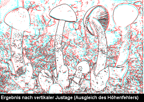 Nach vertikalem Ausgleich ist der Höhenfehler nicht mehr erkennbar - zumindest in dem Mittelbereich des Bildes - in den Ecken sind Unterschiede erkennbar die von einer konvergenten Stellung der Kameras herrührt. Dieser Fehler ist in diesem Beispiel gut erkennbar an unterschiedlichen Größen links und rechts im Bild (rechts ist das rechte Bild (rot) größer, links ist das linke Bild (cyan) größer).